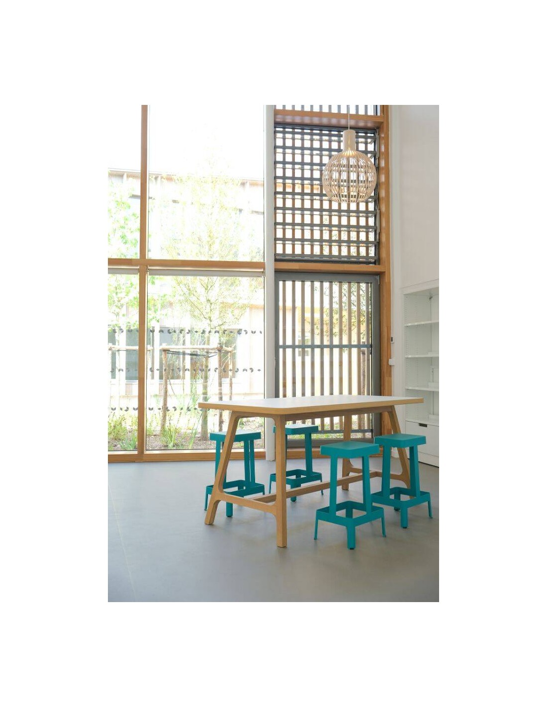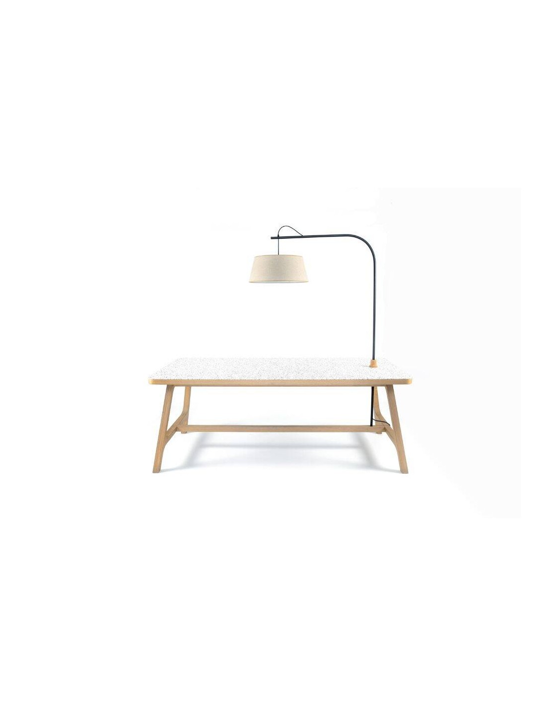 Table T01 - Design Olivier Beune - 100 % Française - Conception, Matière, Fabrication. Piètement en chêne français, plateau en réemploi revêtement Tarkett en PVC recyclé. Existe en version haute et standard, de 180 à 200cm, avec lampe et électrification en option.